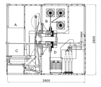 | 치수 (WxDxH): 1400 x 2800 x 2600 | 스위치장치 구조도 A 릴레이 계기실 B 버스실 C 회로 차단기실 D 케이블 |