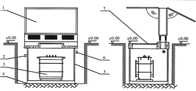 | 그림 1 반 매장 상자 변압기 구조의 개략도 1-라이트 박스 유형 전력 분배 장비: 2 - 고전압 케이블 입구; 3 - 지하 결합 변압기: 4 - Pitpit 기초 설치 구멍 5-Prefabricated Ground Play 기초; 6 - Low - voltage 케이블 출구 구멍; 7 - Pit 작동 포트 덮개 |